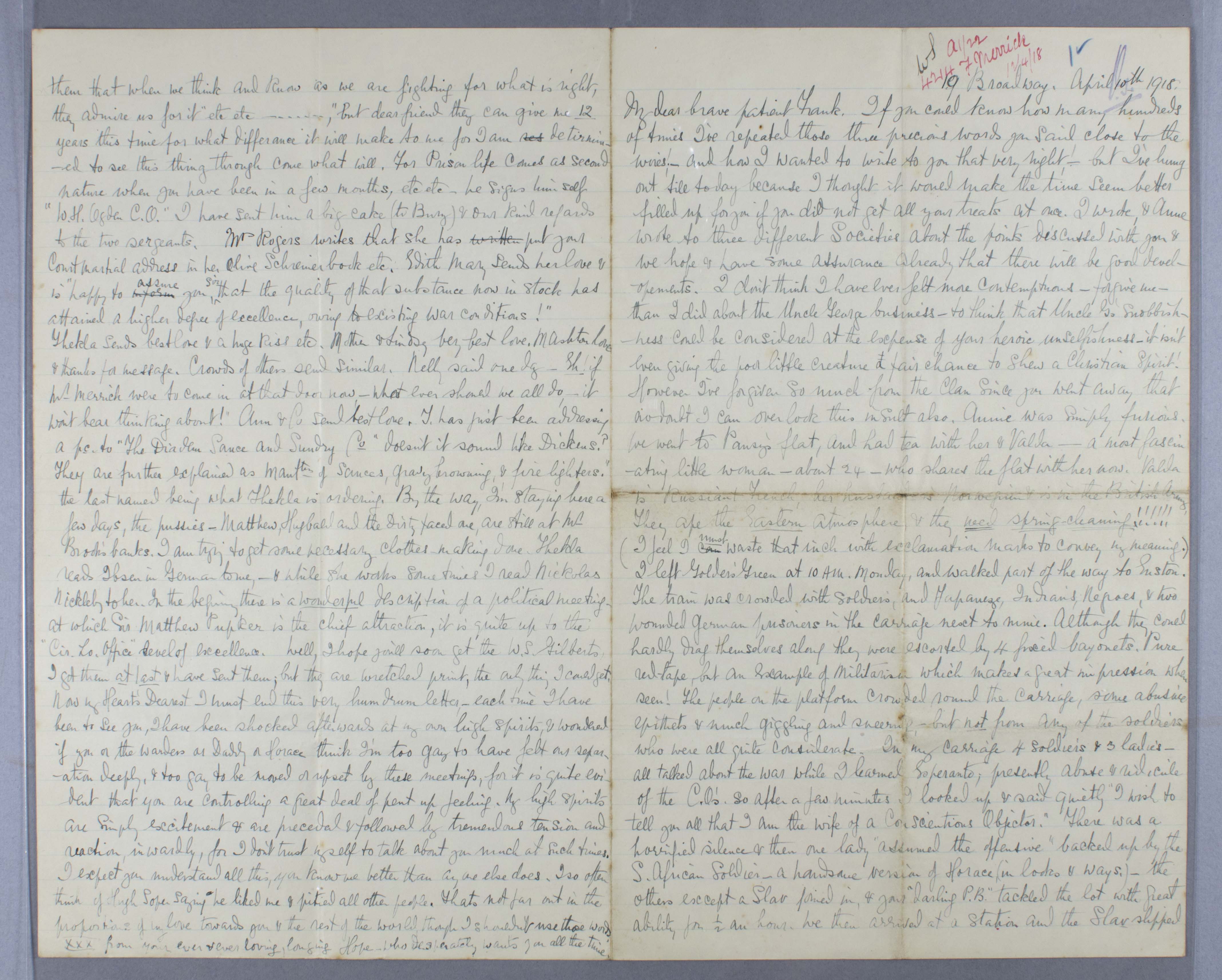 …I left Golders Green at 10am, Monday, and walked part of the way to Euston. The train was crowded with soldiers, Japanese, Indians, Negroes & two wounded German prisoners in the carriage next to mine. Although they could hardly drag themselves along they were escorted by 4 fixed bayonets. Pure red tape, but an example of Militarism which makes a great impression when seen! The people on the platform crowded round the carriage, some abusive epithets and much giggling and sneering – but not from any of the soldiers who were all quite considerate. In my carriage 4 soldiers and 3 ladies – all talked about the war while I learned Esperanto, presently abuse and ridicule of the C.Os. So after a few minutes I looked up and said quietly “I wish to tell you that I am the wife of a Conscientious Objector”. There was a horrified silence & then one lady “assumed the offensive” backed up by the S. African Soldier… The others except a Slav and your darling “P.B.” tackled the lot with great ability for ½ an hour. We then arrived at a station and the Slav slipped out of the train & returned with a cup of tea for me. The other men then rushed out & got some tea for the other ladies, & themselves. I had previously given my bottle of coffee with milk & sugar to a young soldier, who had been travelling since early morning. The arguments continued – these men had only come across members of the Non. Com: Corps, & when I explained that a real C.O. would not be in the N.C.C. they were quite at a loss – in an hour all were my very good friends & eventually all expressed real appreciation of the real C.Os whom they knew nothing about and declared that they could not stand Solitary Confinement, even for a week. They were all very nice men, but had never thought much & knew very little outside their own daily doings…